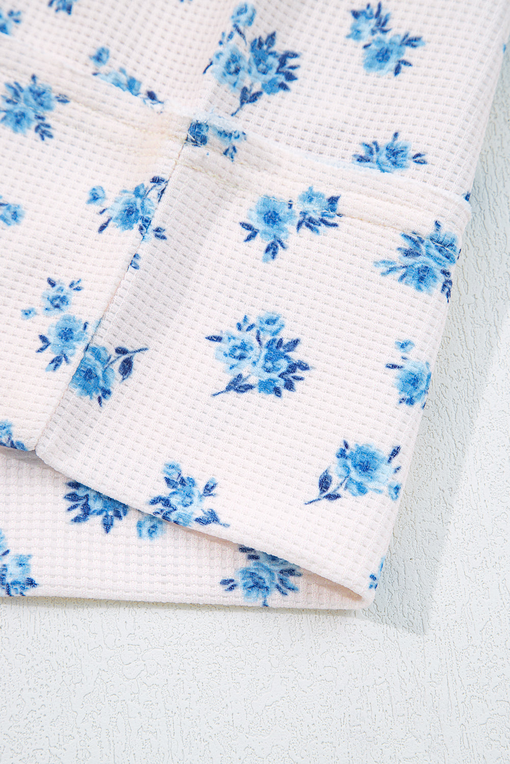 Beige Floral Print Waffle Patchwork Balloon Sleeve V Neck Oversized Top