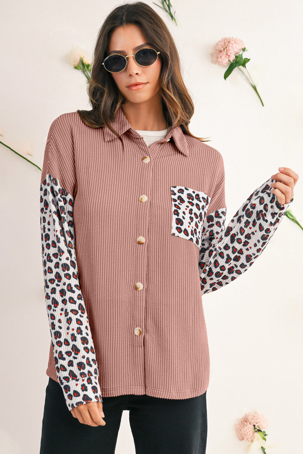 - Stand out in style with the leopard patchwork shacket, featuring a unique twist of ribbed design for added texture and flair.