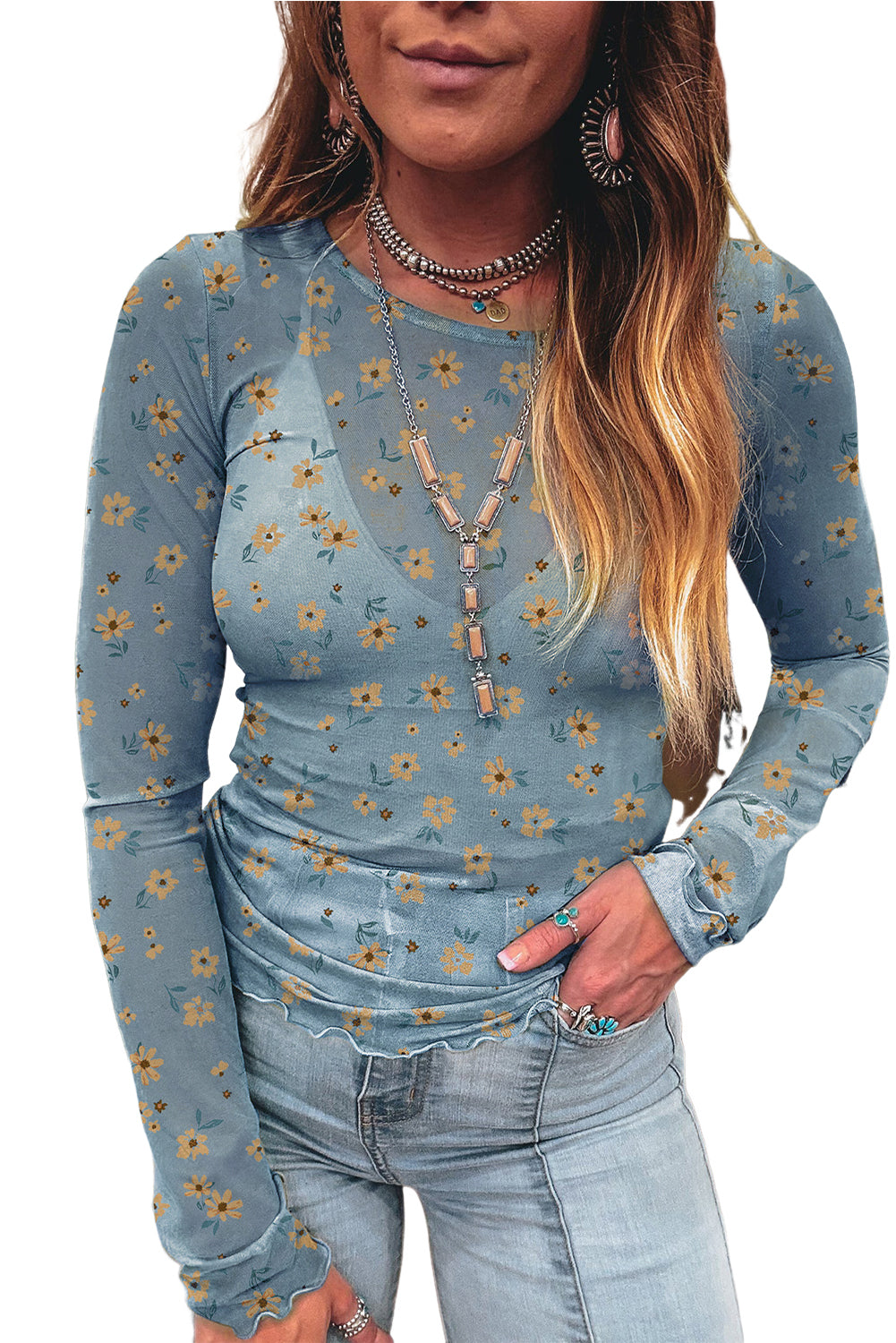 Laurel Green Floral Print Mesh Slim Fit Long Sleeve Top