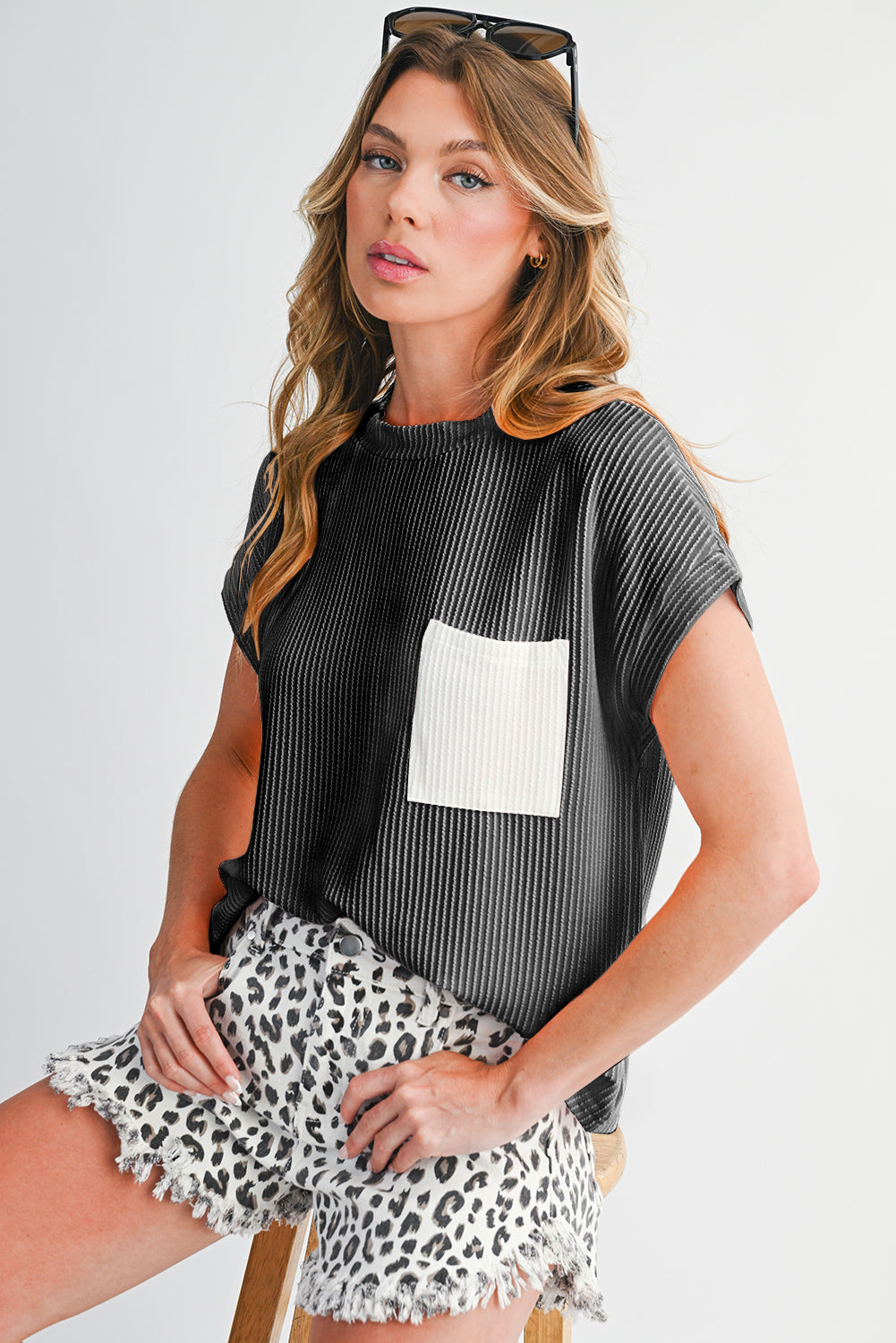Pink Corded Colorblock Pocket Crew Neck T Shirt