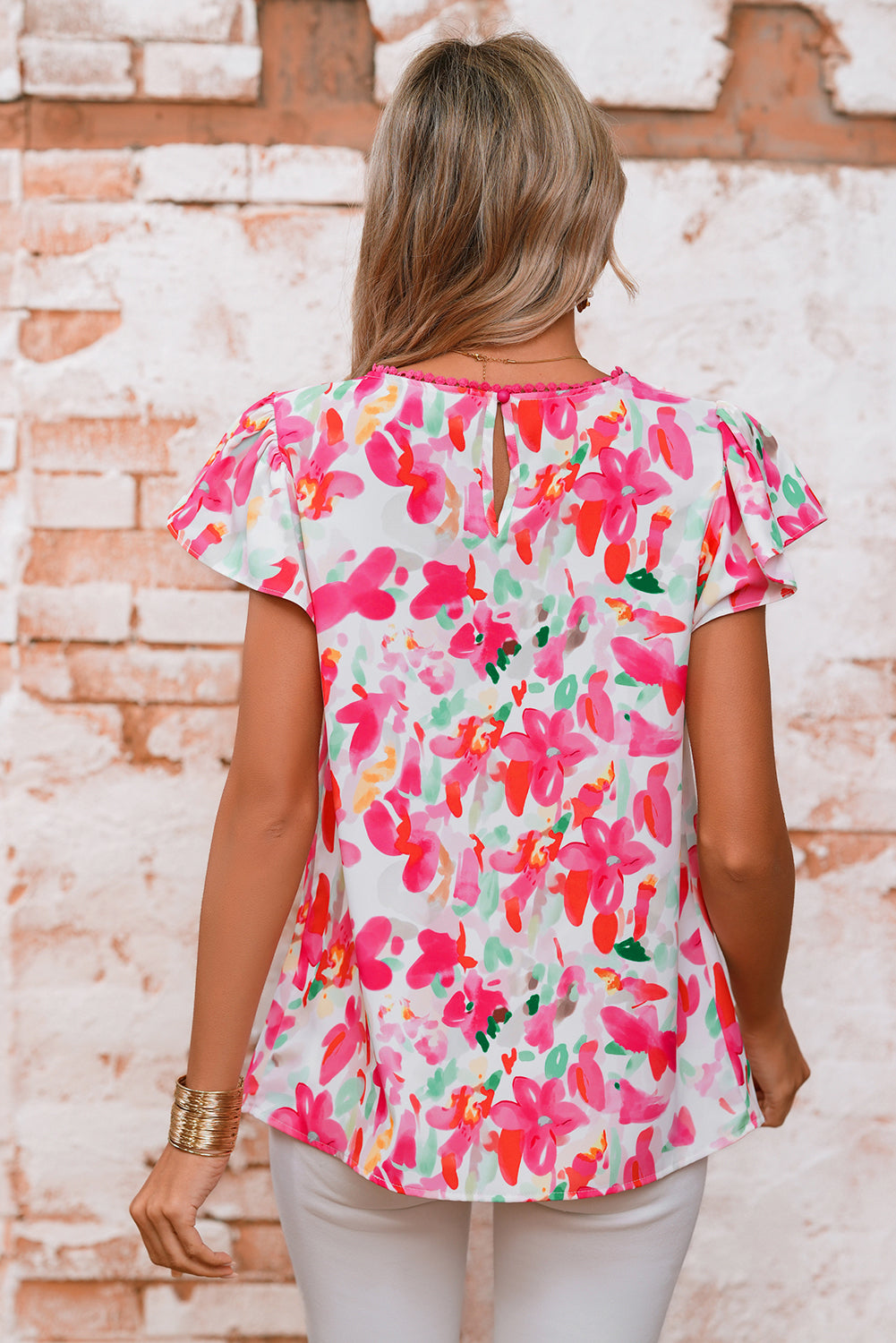 Rose Floral Print Flutter Sleeve Round Neck Blouse